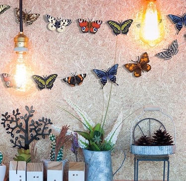String up butterfly garlands made from paper, felt, or even metal for a whimsical wall accent or party decoration that doubles as home decor. These are especially pretty draped over mirrors or doorways.