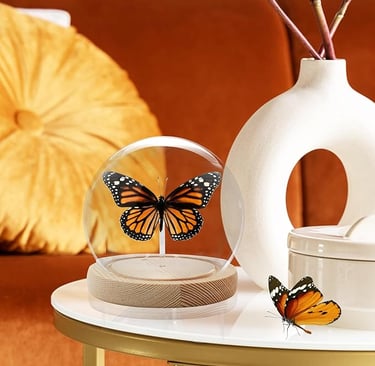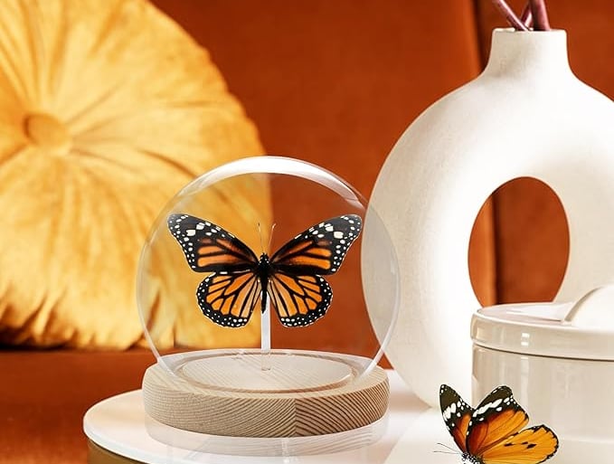 Pressed butterfly displays inside glass domes or wooden shadow boxes can turn your shelf into a mini natural history museum. Faux or ethically sourced replicas are available for a cruelty-free option.